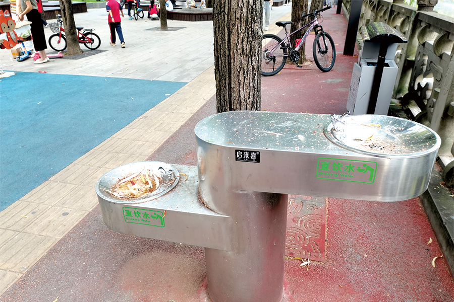 在金港橋旁的直飲水點,記者嘗試按壓出水按鈕,多次操作后仍無水流流出。飲水臺的接水盆內(nèi)積著污水,漂浮著煙頭、紙屑和灰塵(如圖),周邊還散落著塑料袋等垃圾。“以前晨練完都來這接水,很久都沒水了,接水盆也沒人清理。”在附近散步的市民王大爺無奈地說,最近常有游客過來嘗試接水,發(fā)現(xiàn)沒水后都很失望。