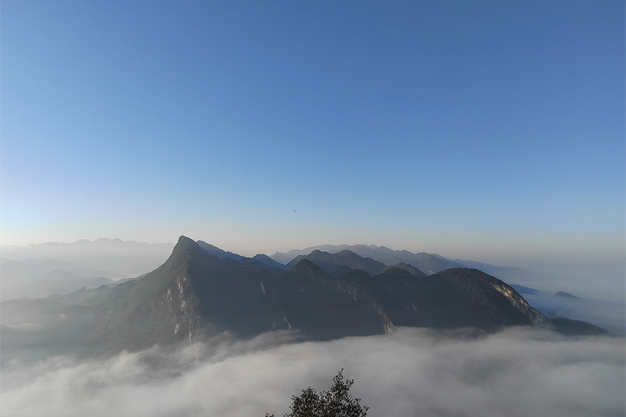 氣勢恢宏、變幻莫測的云海像一床巨大的棉被把河谷、村寨、田園、森林罩住,給人一個妥妥的陰天感覺,云海之上卻是藍天白云、陽光明媚。