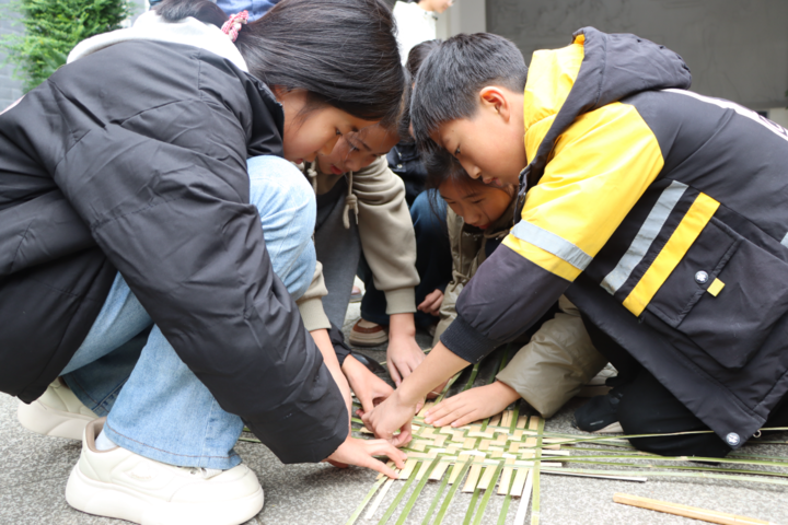 活動現場,傳承人現場演示了竹編技藝的制作過程,從選材、切割、編織到成型,每一個環節都展現了匠人的智慧和技藝。“看這里,這根篾絲壓住那根,然后繞過來……”“這根是這樣編嗎?”“對的,就是這樣。”在傳承人的指導下,孩子們圍坐在一起,專注地擺弄著手中的竹條,學習竹編的基本技巧。從簡單的編織圖案到復雜的立體造型,每一個步驟都充滿了挑戰與樂趣。