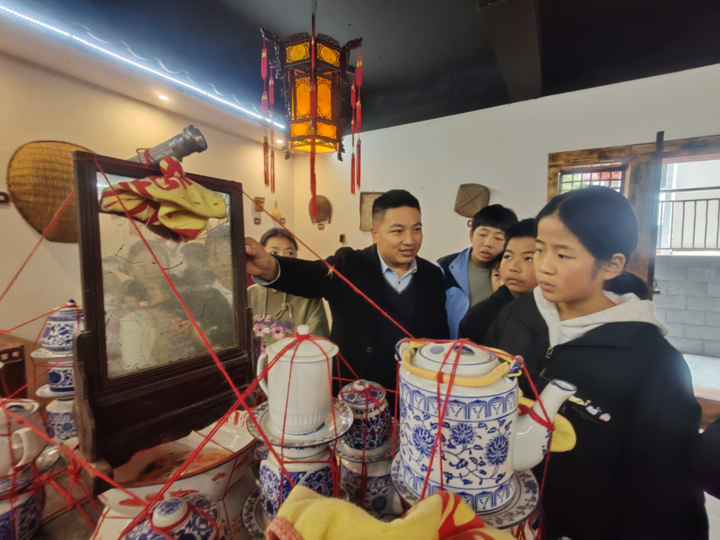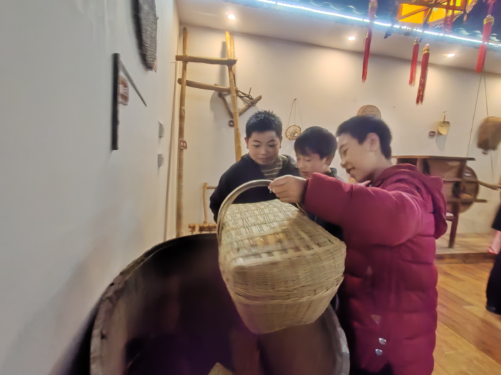 活動當天,孩子們在兩位傳承人的帶領下,走進學校的非遺博物館,館里精美的竹編、祖輩傳下的農具、嫁妝碗捆綁技藝等讓孩子們眼前一亮,孩子們仔細聆聽傳承人對相關展品的講解,紛紛驚嘆不已。