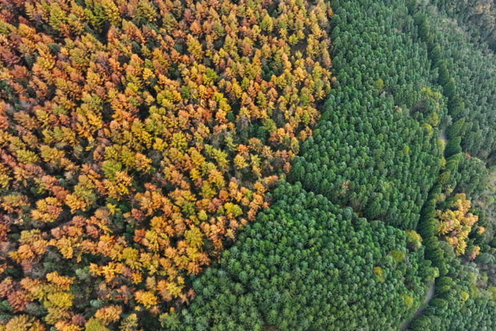 初冬,黔江國家森林公園灰千梁子景區迎來了最迷人的季節。森林里一側落葉松金黃燦爛,一側柳杉翠綠如初,兩種顏色相接,呈現出“平分秋色”的美麗景觀(無人機照片),吸引了眾多游客前往打卡、游玩。 (首席記者 楊敏 攝)